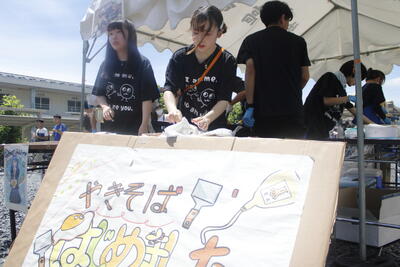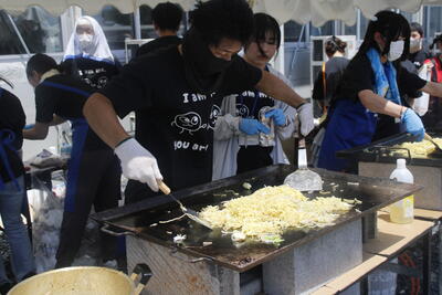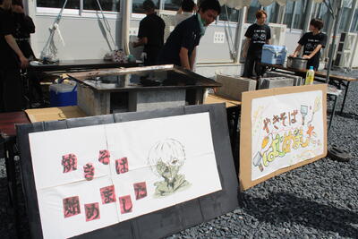 模擬店の焼きそばは、去年も大好評だったので、販売量を2倍にしました。朝から食材を切って切って焼いて焼いて焼きまくった結果、今年度もお昼前には完売となりました。